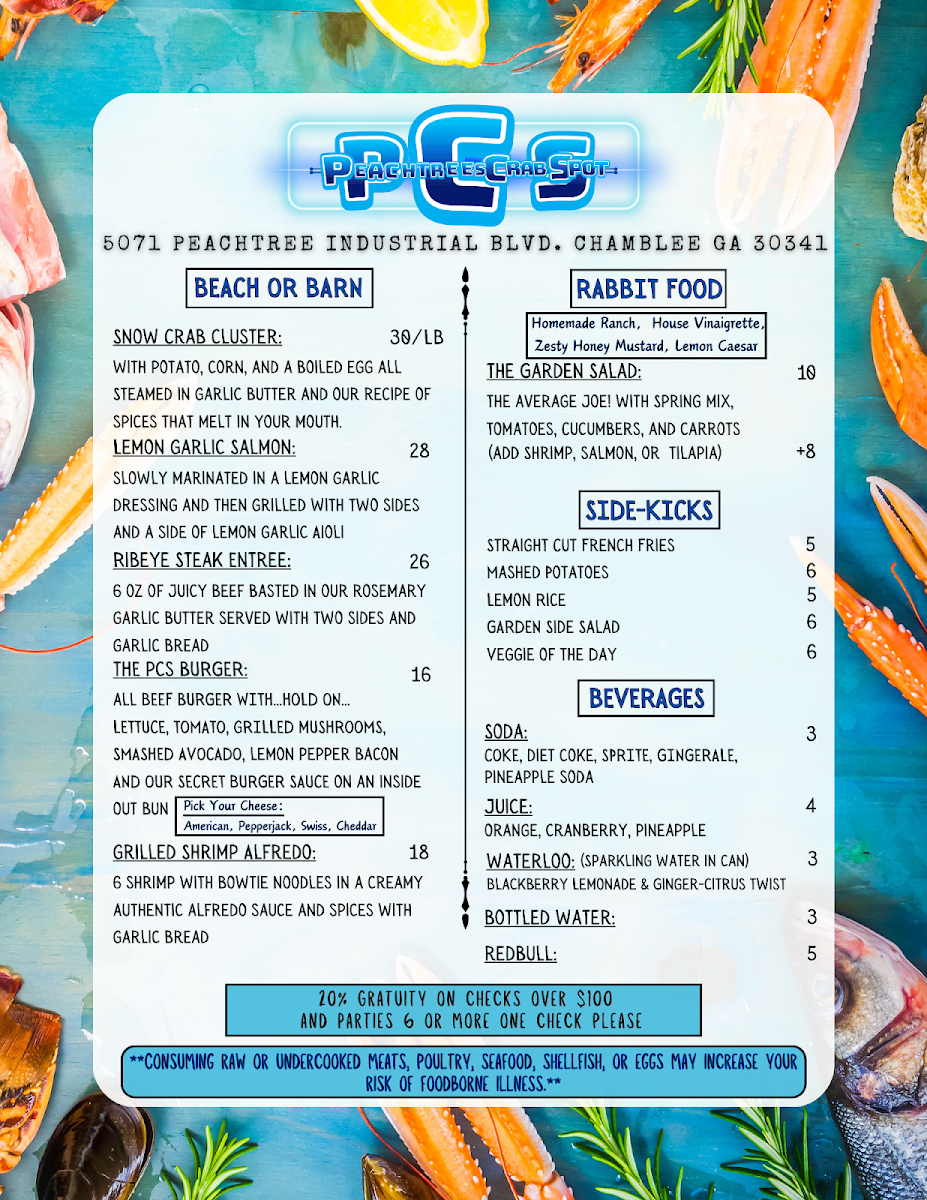 If you're in the mood for some truly fresh and flavorful seafood, the Peachtree's Crab Spot Menu is sure to hit the spot. Located in the heart of Chamblee, GA, this restaurant brings the best of the ocean to your plate. Whether you're craving a classic crab boil, tender shrimp, or savory lobster, each dish is prepared with the finest ingredients to ensure the most delicious experience. With a variety of options ranging from perfectly seasoned seafood platters to unique specialty dishes, there's something to please every palate. The Peachtree's Crab Spot Menu not only highlights the best seafood but also includes satisfying sides and fresh, mouthwatering sauces to complete your meal. Perfect for a casual dinner or a gathering with friends, this menu is designed to keep you coming back for more.
